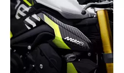 軽量で高品質な仕上がりを生むカーボンファイバー製サイドパネル、フロントマッドガード、さらに、グリップ性を高めるディンプル加工が施されたMoto2(TM)エンボス入り専用シート、クリアレンズのリアライト、サイレンサーにレーザー刻印された Moto2(TM)ロゴなど、随所に特別感のある仕様が加えられています。外装カラーは、ミネラルグレー × クリスタルホワイト を基調に、鮮やかな Triumph Performance yellowのリアサブフレームと同色で統一されたホイールストライプを組み合わせ、レーシングDNAを強く感じさせるスタイリングを実現。また、ビレット削り出しのトップヨークには一台ずつ固有のシリアルナンバーが刻まれ、Moto2(TM)ブランドロゴと、Moto2(TM)専用スタートアップ画面を持つTFTディスプレイと並んで配置されることで、限定モデルならではの所有価値とコレクション性を際立たせています。