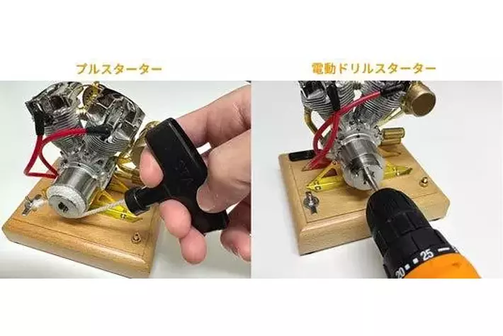 エンジンはプルスターターと電動ドリルを使用した始動方法の2種あります。