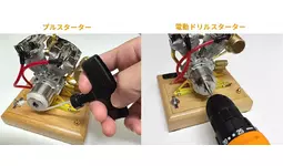 エンジンはプルスターターと電動ドリルを使用した始動方法の2種あります。