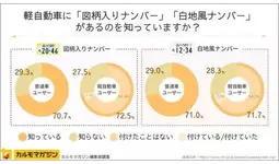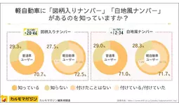 ・軽自動車における「図柄入りナンバー」と「白地風ナンバー」の認知度は、いずれも普通車ユーザー、軽自動車ユーザーともに70%以上。一方、普及率は白地風ナンバーのほうが1.9ポイント高い。