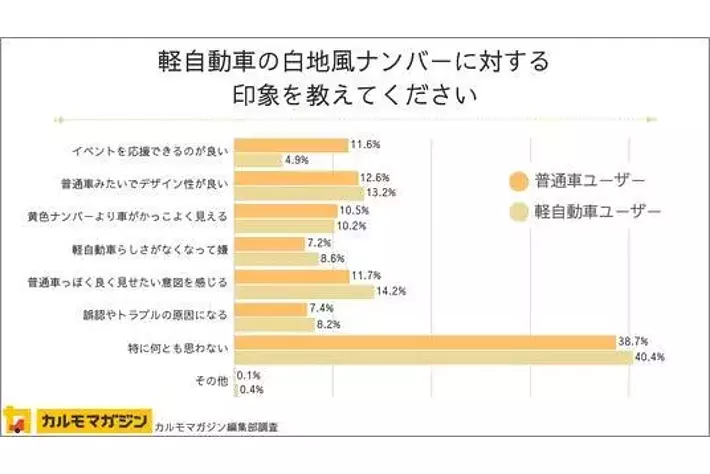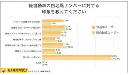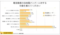 ・軽自動車が白地風ナンバーを装着することに対し、普通車ユーザーはポジティブにとらえている傾向がある。一方、軽自動車ユーザーはナンバープレートの色による識別に敏感で、特別仕様ナンバーの趣旨よりも見た目を重視している傾向が明らかとなった。