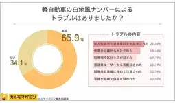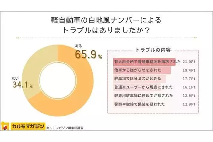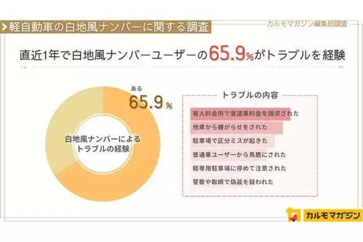 ・白地風ナンバーを付けた軽自動車ユーザーの65.9%がトラブルを経験