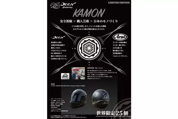 本作は、ライダーの頭を護ることを第一に考え、小さな違いを積み重ねてきた世界最高峰のヘルメットブランド Arai(アライ)をベースに、モータースポーツ界で活躍するピンストライパー VEATON(ビートン)氏が家紋(KAMON)モチーフを一筆一筆描き込んだアートワーク仕様です。