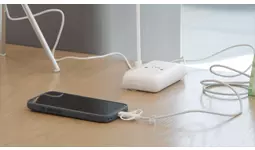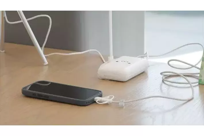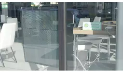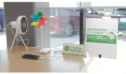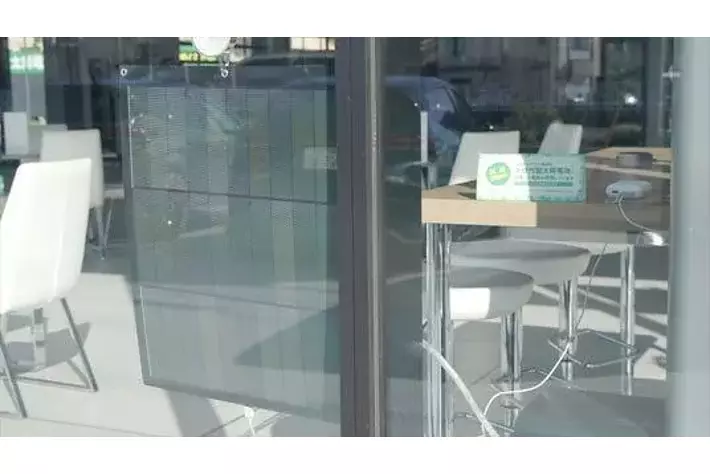 ▲軽さを生かし、ガラス面へ設置。 ▲発電した電力はスマホ充電など、来店したお客さまが実際に使用可能。