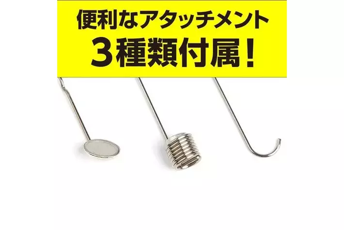 レンズ先端に付けて使用するミラー、フック、マグネットの3種類のアタッチメントが付属します。