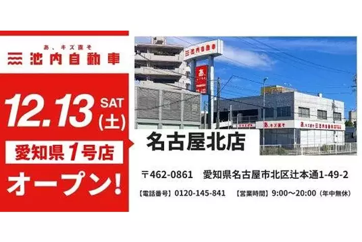 自動車の板金塗装事業を手掛ける株式会社イケウチ(本社:東京都千代田区、代表取締役社長:池内 美友、以下「当社」)は、2025年12月13日(土)に池内自動車 名古屋北店(愛知県名古屋市北区)をオープンいたします。