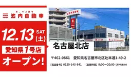 自動車の板金塗装事業を手掛ける株式会社イケウチ(本社:東京都千代田区、代表取締役社長:池内 美友、以下「当社」)は、2025年12月13日(土)に池内自動車 名古屋北店(愛知県名古屋市北区)をオープンいたします。