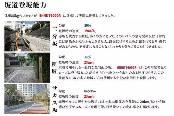 下図は坂道別の実測データです。T600GRは最も急激な三分坂ですら85kgのスタッフが乗車して19km/hの速度で登りきることができました。