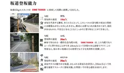 下図は坂道別の実測データです。T600GRは最も急激な三分坂ですら85kgのスタッフが乗車して19km/hの速度で登りきることができました。
