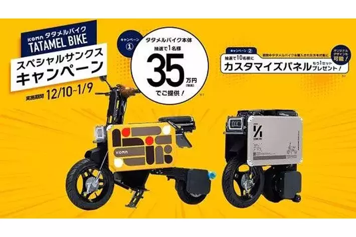 株式会社ICOMA(本社:所在地、代表取締役:代表者名)は、電動折りたたみバイク「タタメルバイク」を特別価格で販売する「スペシャルサンクスキャンペーン」を実施いたします。抽選で1名に35万円(税別)で販売するほか、さらに抽選で10名の方に、タタメルバイク購入時にオリジナルパネルを1枚プレゼントします。