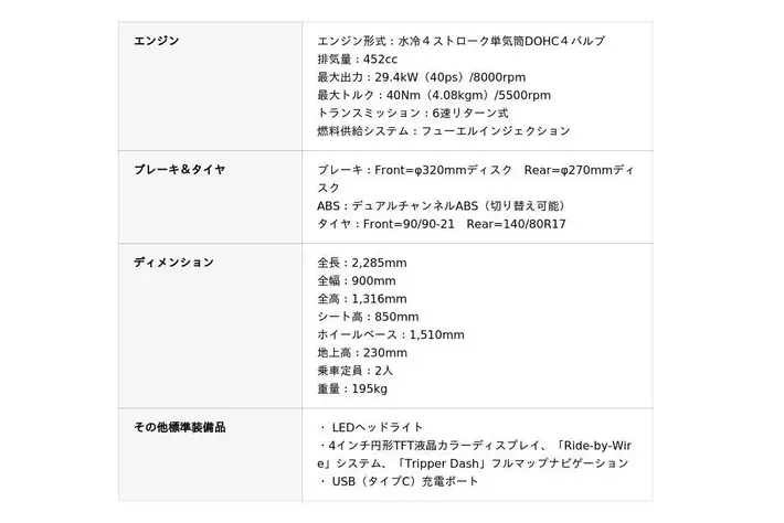 - ヒマラヤの玄関口として知られるマナ峠からインスピレーションを得た新色「マナ・ブラック」を採用。ライドバイワイヤとオンロード/オフロードを問わない幅広い性能を備えた「SHERPA 450」エンジン・プラットフォーム