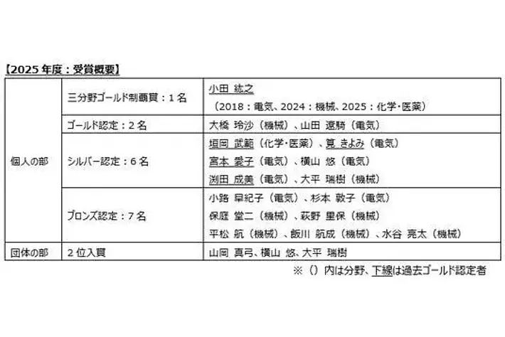 ・ゴールド認定:12名(電気分野6名、機械分野6名、化学・医薬分野5名)