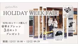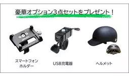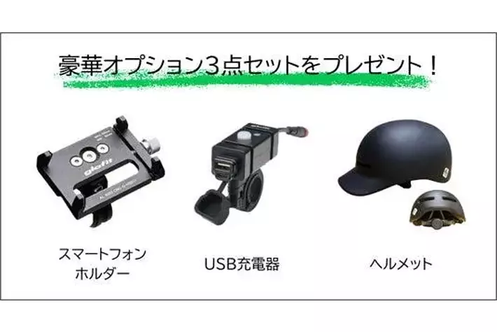 期間中、公式オンラインショップの特別購入ページより「電動サイクルNFR-01」シリーズを購入すると、ライドを快適にする豪華オプションを3点セット(スマートフォンフォルダー、USB充電器、ヘルメット、合計17,320円相当)をプレゼント。
