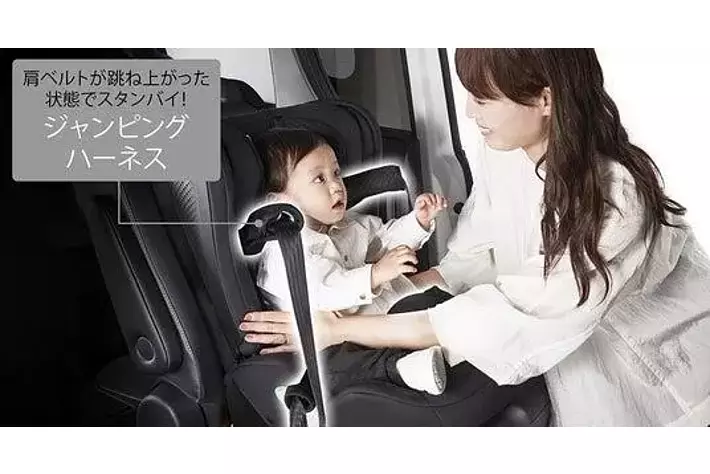 1)「ジャンピングハーネス」と高さを抑えた座面で、乗り降りラクラク肩ベルトが跳ね上がった状態をキープする「ジャンピングハーネス」搭載で、お子様の腕を通しやすい。お子様が成長しジャンプ機能が不要になった際には、ハーネスを背もたれ部に簡単に収納することが可能(特許第6966891号)です。また座面は、パパママが乗せやすく、お子様が1人でも乗り込みやすい高さに設計することで乗り降りをサポートします。