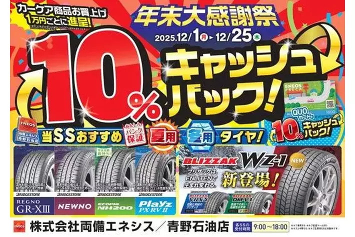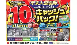 両備グループの株式会社両備エネシス(本社:岡山県岡山市中区国富1-2-13)と株式会社青野石油店(本社:岡山県津山市二宮598)は、2025年12月1日(月)から12月25日(木)までの間、運営するサービスステーションにて「年末大謝恩祭」を開催し、カーケア商品を対象に10%キャッシュバックキャンペーンを実施しています。期間中、カーケア商品を1万円(税込)お買い上げいただくごとに、QUOカード1,000円分をプレゼントいたします。