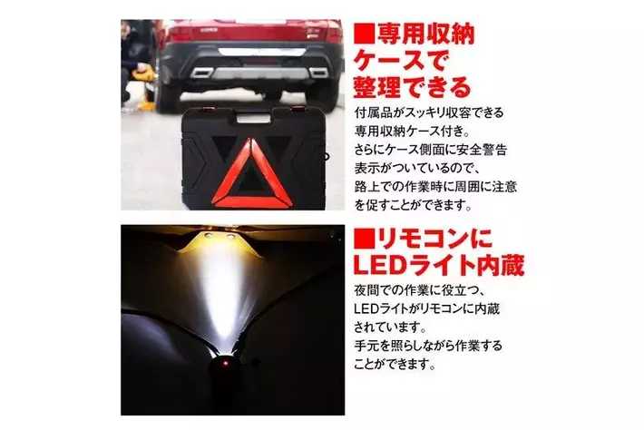 付属品がスッキリ収容できる専用収納ケース付き。いざというときのために車のトランクに標準装備できます。 さらにケース側面に安全警告表示がついているので、路上での作業時に周囲に注意を促すことができます。