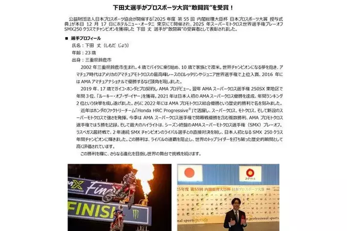 公益財団法人日本プロスポーツ協会が開催する「2025年度 第55回 内閣総理大臣杯 日本プロスポーツ大賞 授与式典」が本日 12 月 17 日にホテルニュー・オータニ 東京にて開催され、2025 年スーパーモトクロス世界選手権プレーオフ SMX250クラスでチャンピオンを獲得した 下田 丈 選手が“敢闘賞”の受賞者として表彰されました。