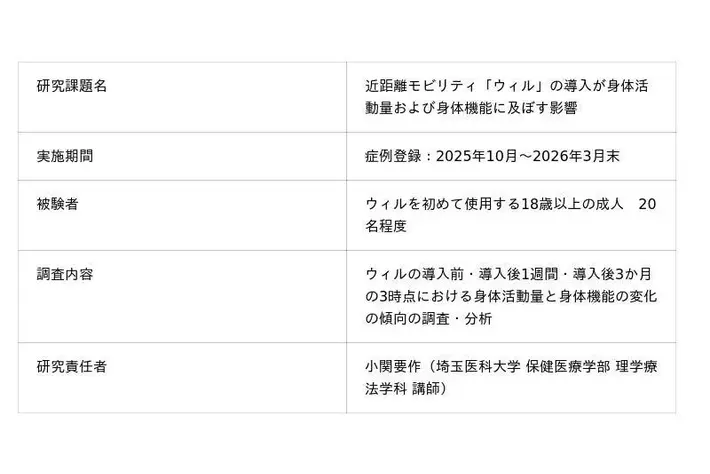 本研究は、ウィルの導入前後における身体活動量と身体機能の変化の傾向を調査・分析し、近距離モビリティがシニアの日常活動や身体機能に与える影響を定量的に把握することを目的とします。