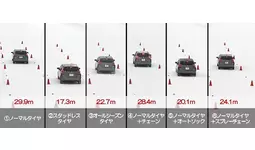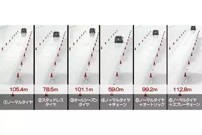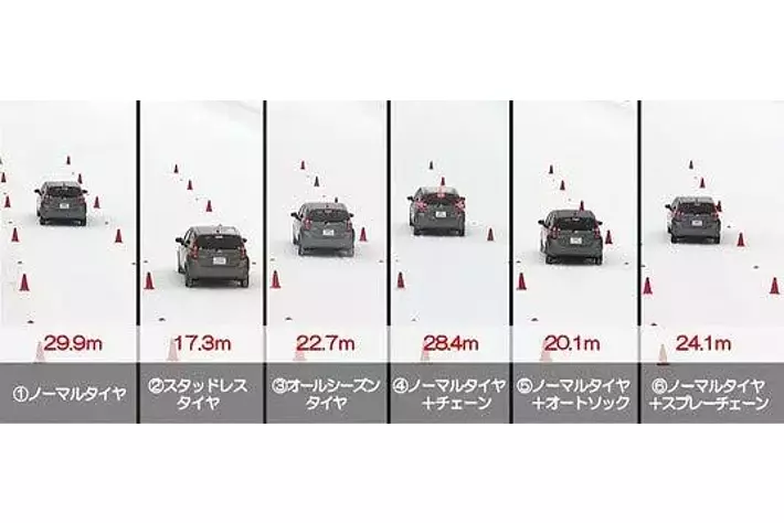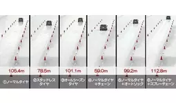 JAFは、6種類のタイヤを用いて圧雪路(雪が踏み固められた状態の路面)と氷盤路(凍結した路面)での制動距離実験を実施しました。
