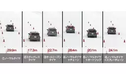 スタッドレスタイヤが最も短い距離で停止できた一方、ノーマルタイヤはその約1.7倍も制動距離が長くなりました。