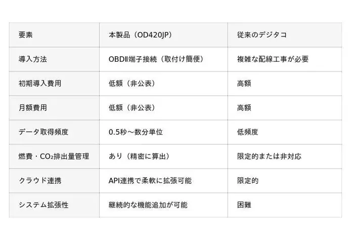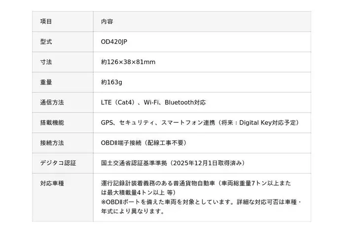 OD420JPはAPI連携を前提に設計されており、顧客が既存の業務システムや運用フローを活かしながら段階的にDXを推進できる柔軟性を備えています。これにより、将来的なデジタコ義務化を見据えた装着率向上を後押しするとともに、業界全体のデジタル化を加速させます。