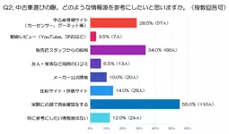 - 一方、「中古車情報サイト(カーセンサー、グーネット等)」は28.5%(57人)と高い割合を占めました。多くの車両を一度に比較できる利便性から、検討初期の情報収集手段として活用されている様子がうかがえます。