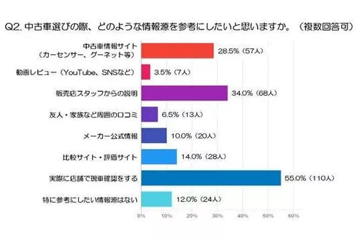 - 次いで多かったのは「販売店スタッフからの説明」で34.0%(68人)でした。専門知識がなくても、疑問点をその場で確認できる点や、車両の状態について直接説明を受けられる安心感が評価されていると考えられます。現車確認とあわせて、対面での情報収集を重視する傾向が見て取れます。