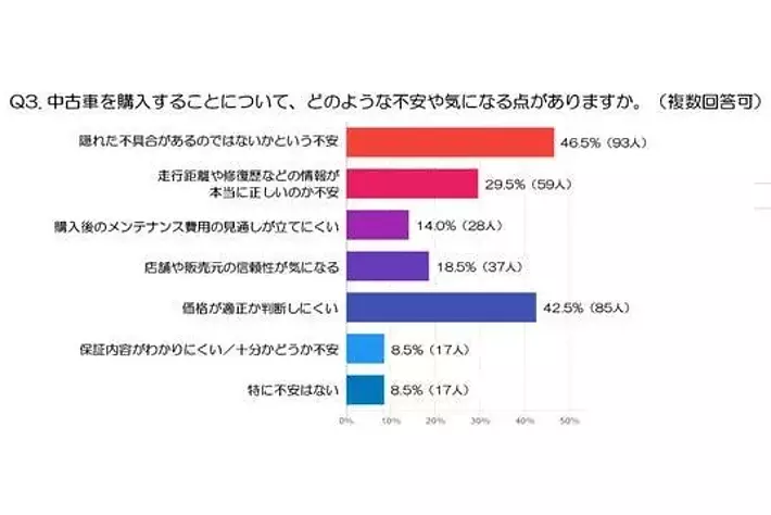 - 次に多かったのは、「価格が適正か判断しにくい」で42.5%(85人)でした。同じ車種・年式であっても価格に幅がある中古車市場では、「この金額が本当に妥当なのか分からない」と感じる人が少なくありません。価格の根拠が見えにくい点も、不安につながっていると考えられます。