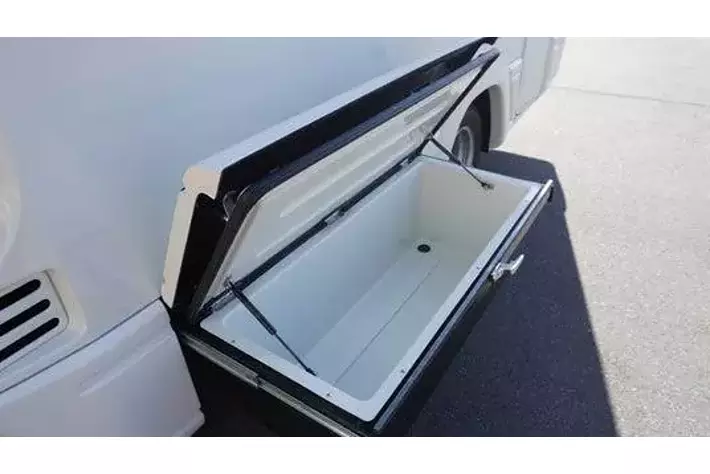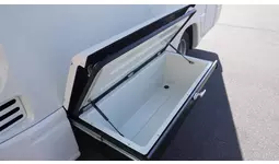 リア左側には引き出し式外部収納庫を配置。防水仕様のため、雨天時でも内部に水が溜まる心配はありません。約132Lの大容量を確保し、耐荷重は100kgまで対応。キャンプやアウトドア用品等、余裕を持って積載できる頼もしい収納庫です。