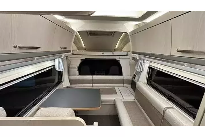 スカイライトルーフ:夜空を眺めながら眠りにつける人気のオプション。自然光を取り入れて車内を明るくし、換気にも役立つ。網戸とブラインドも備え、用途に応じて調節できます。