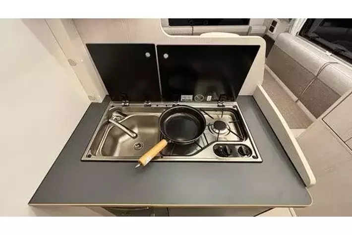 ステンレスシンク&2バーナーコンロ:ステンレスシンクと2バーナーコンロを一体化したユニットを採用。汚れに強く手入れしやすい。使用しない時は、耐熱ガラスカバーを閉めるとフラットになり調理台スペースを広げられます。