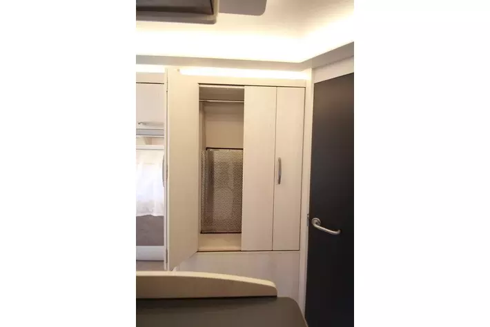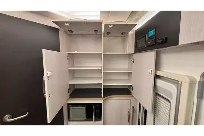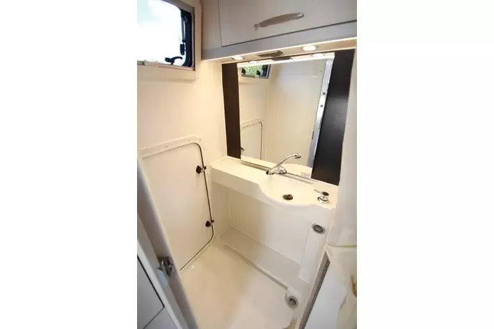 マルチルーム:天井にはベンチレーター、床には防水シャワーパンを装備。側面にはミラーと収納棚を設置し、温水シャワーが使用可能。オプションのカセットトイレも設置できます。外部アクセスドアにより荷物の出し入れも行えます。