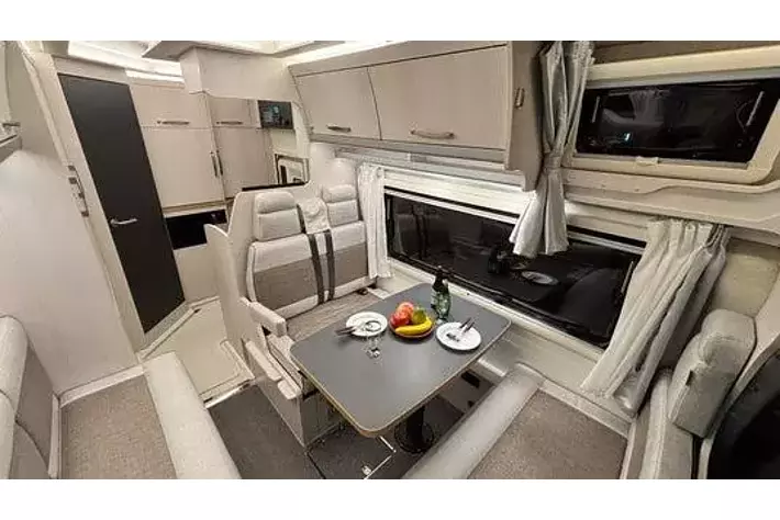 - リアエントランス&前向きギャレーエントランスを車両後方に配置したリアエントランスモデルは、乗り込んですぐの位置に前向きのギャレーをレイアウト。右側にリアカウンターキャビネット(オプション)とシューズボックスを備え、使い勝手に優れた動線を構築しています。