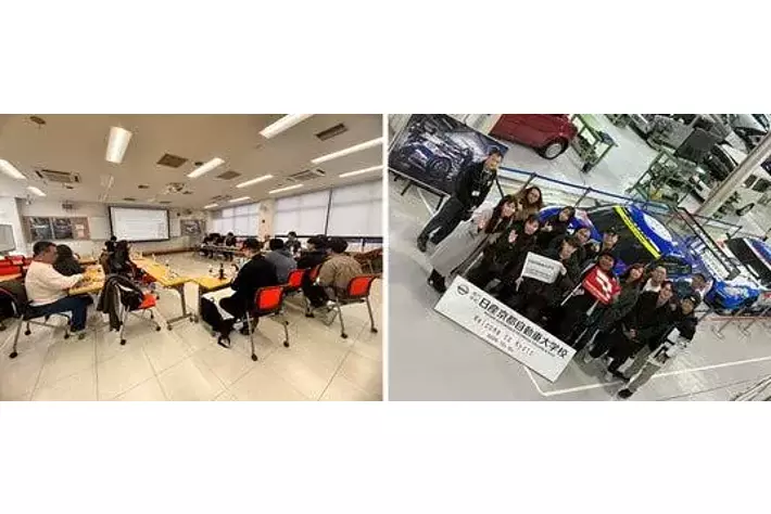 ツアー初日は、日産京都自動車大学校を訪問。整備実習施設や最新設備の紹介に加え、実際に学生が整備作業を学んでいる現場を間近で見学しました。プロを目指す学生たちの真剣な姿勢や、細部まで行き届いた実習環境に、参加者からは驚きの声が上がりました。