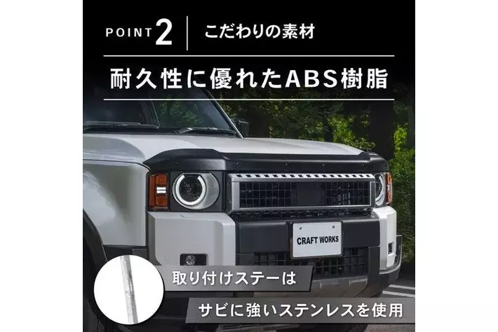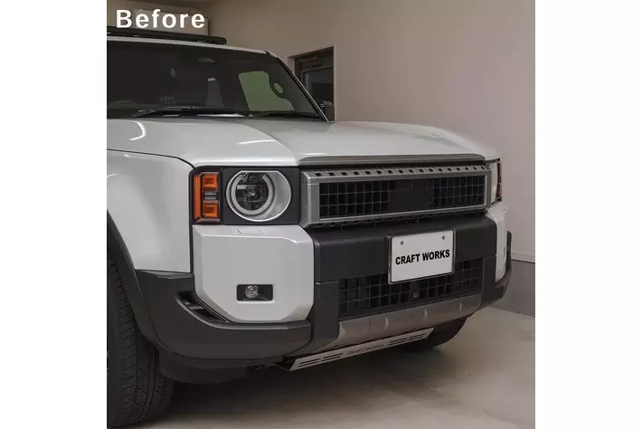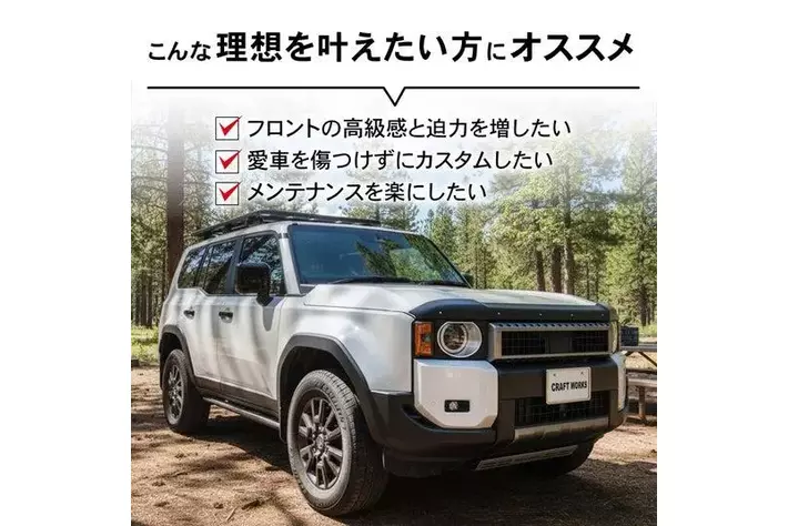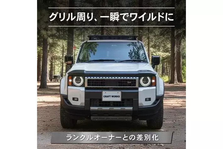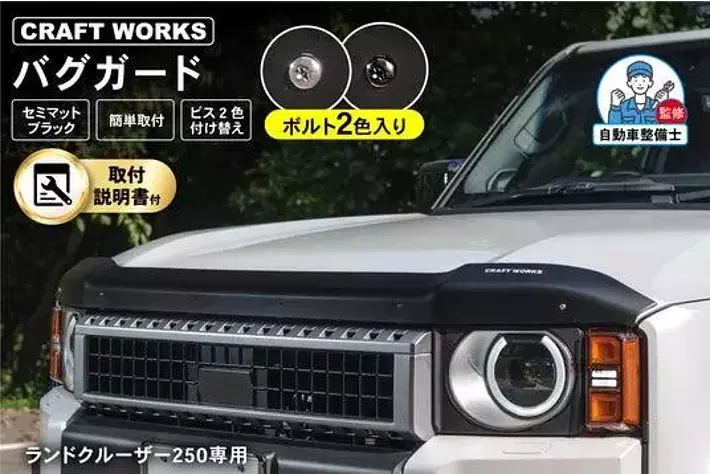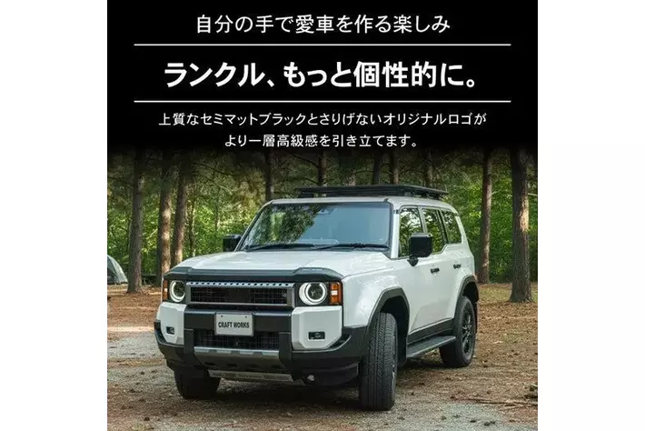 この度、Fun Standard株式会社(株式会社RKB毎日ホールディングス グループ、本社:福岡県大野城市、代表取締役:大屋良介、笹森 広貴)が展開する自動車アクセサリブランドCRAFTWORKS(クラフトワークス)は、ランクル250専用「バグガード」を2025年11月より予約発売開始しました。車体加工不要、届いてすぐに装着が可能です。上質なセミマットブラックとさりげないオリジナルロゴがより一層高級感を引き立てます。