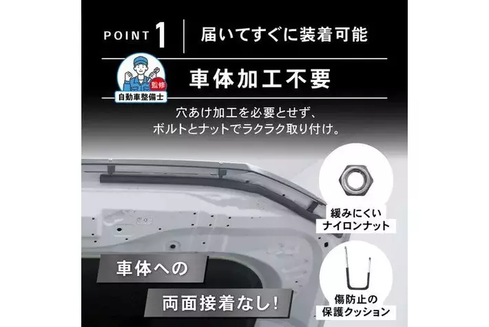 届いてすぐに装着可能穴あけ加工を必要とせず、ボルトとナットでラクラク取り付け。