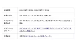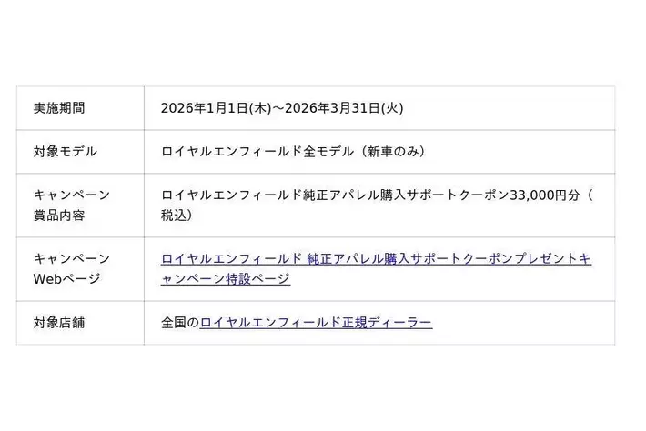 この度、ロイヤルエンフィールド全モデルと純正アパレルの販売拡大を目的に、2026年1月1日(木)から2026年3月31日(火)までの間、「ロイヤルエンフィールド純正アパレル購入サポートクーポンプレゼントキャンペーン」を実施いたします。