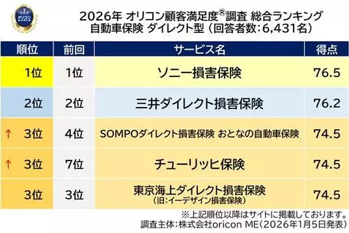 『自動車保険 ダイレクト型』総合ランキング(2026年 オリコン顧客満足度(R)調査)