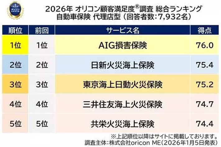 『自動車保険 代理店型』総合ランキング(2026年 オリコン顧客満足度(R)調査)