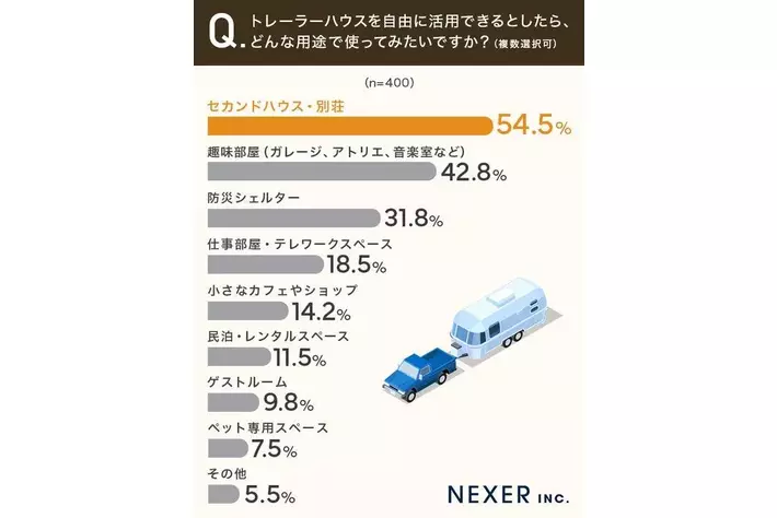 ■54.5%が「セカンドハウス・別荘」としてトレーラーハウスを活用したいと回答