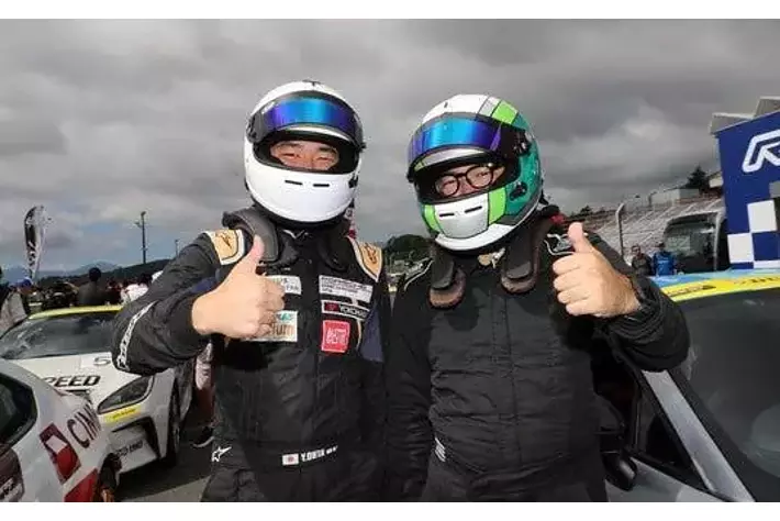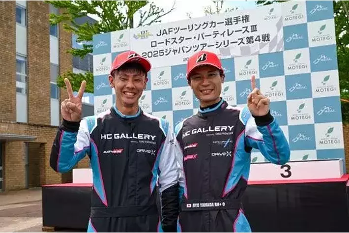 頂上決戦2025のSundayRace優勝者マイケル田中選手(右)アマチュア箱物最高峰のレースの一つであるGR86/BRZCup。67名の参戦者があった富士スピードウェイラウンドで、初参戦20位という快挙を成し遂げた。
