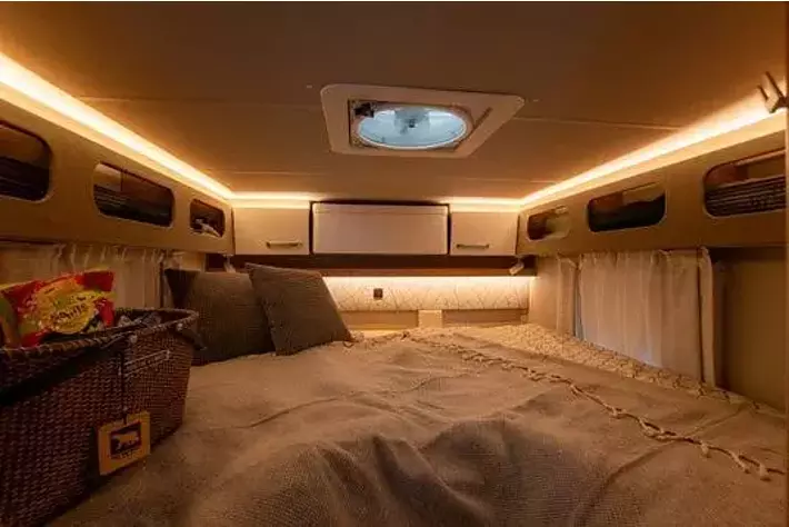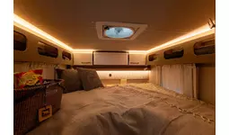 室内空間は、ハイエースベースから大きく進化。家の寝室で眠るようなベッド、シャワー、水を使わないトイレなど、