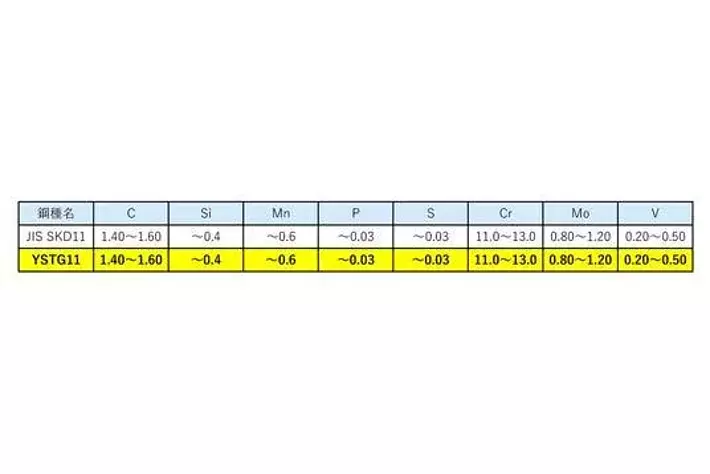 こうしたJIS認証の意義を背景に、今回YSTG11は冷間ダイス鋼のJIS規格である「JIS SKD11」の認証を取得し、国内唯一のJIS SKD11認証材として正式に使用できる材料となりました。