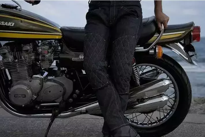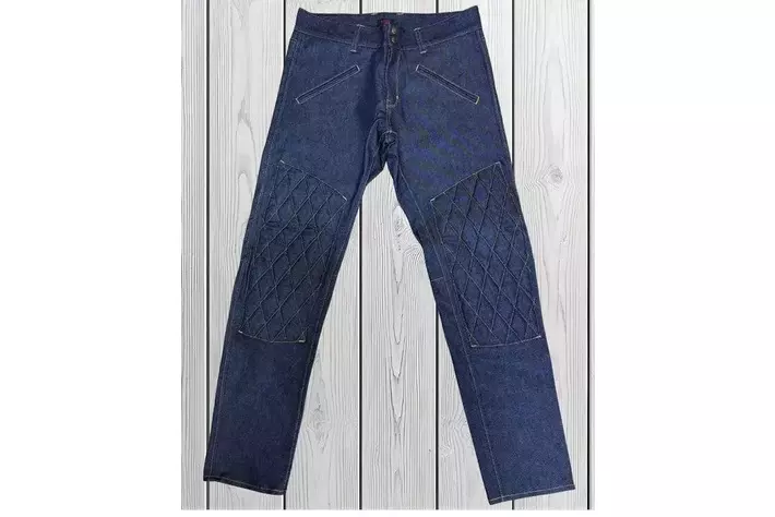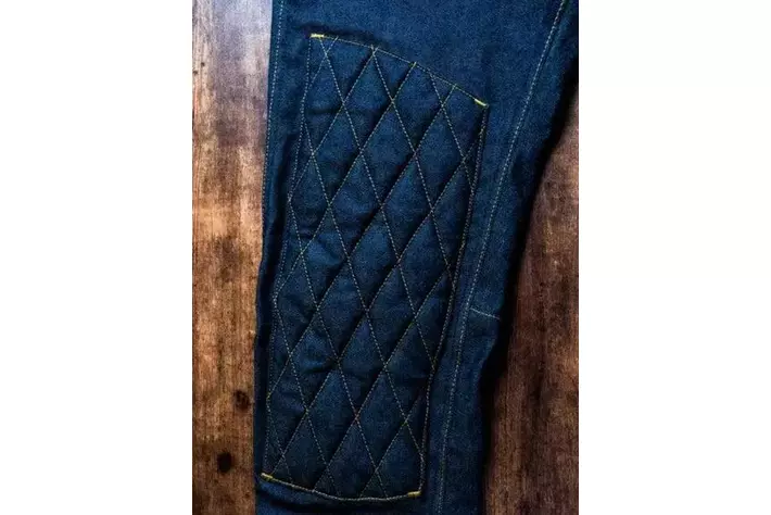 ダイヤ柄膝パデッド(三層構造)特徴的なダイヤ柄は10mm厚ウレタン+別布+デニム構造で柔軟かつ保護性能を両立しています。