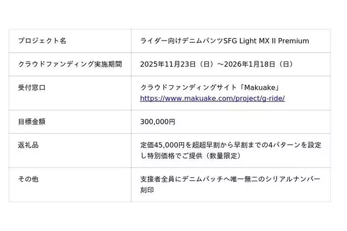 熊本を拠点とするモーターサイクルギアブランドG RIDE(ジー ライド本社:熊本県熊本市)は、昨年11月23日より実施した新たなデニムライン《SFG Light MX II Premium》が応援購入者が70名超、最上位プラン超超早割は完売し達成率850%を突破、いよいよ最終期限2026年1月18日までとなることをお知らせします。