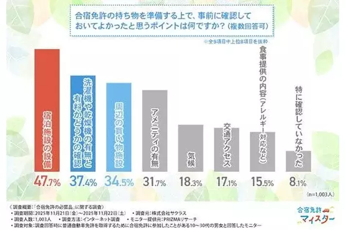 「合宿免許の持ち物を準備する上で、事前に確認しておいてよかったと思うポイント」について尋ねたところ、『宿泊施設の設備(47.7%)』が最も多く、『洗濯機や乾燥機の有無と有料かどうかの確認(37.4%)』『周辺の買い物施設(34.5%)』となりました。