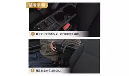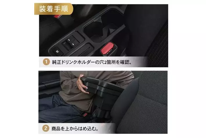 - 純正ドリンクホルダーの穴2箇所を確認。- 商品を上からはめ込む。