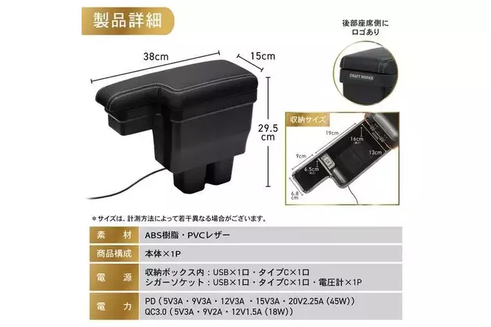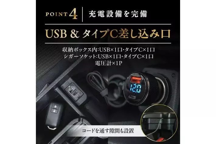 充電設備を完備収納ボックス内:USB × 1口・タイプC × 1口