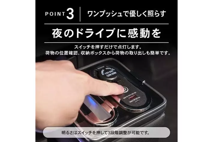 スイッチを押すだけで点灯します。荷物の位置確認、収納ボックスから荷物の取り出しも簡単です。