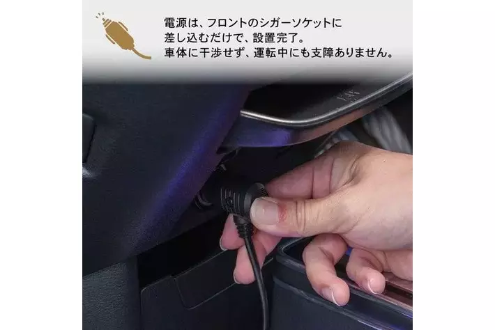電源は、フロントのシガーソケットに差し込むだけで、設置完了。車体に干渉せず、運転中にも支障ありません。